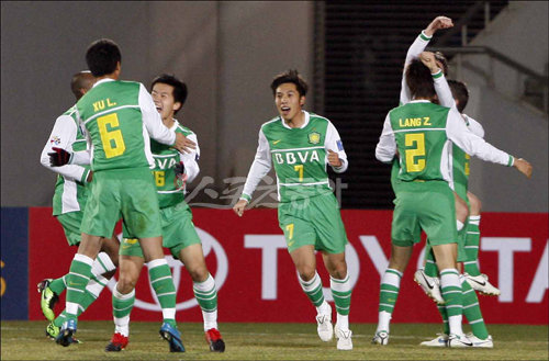 23일 탄천종합운동장에서 열린 AFC 챔피언스리그 E조 3라운드 성남 일화 대 베이징 궈안의 경기에서 전반 베이징 마우리스의 선취득점으로 선수들이 기뻐하고 있다.
