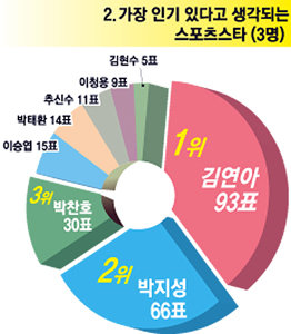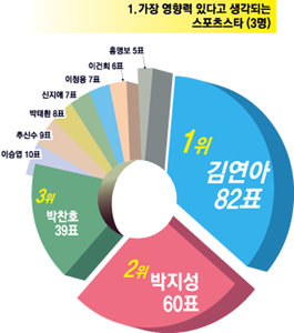 영예의 주인공은 김연아(20·고려대). 그의 이름 석자가 갖는 위력은 대단했다. 국내 스포츠인들은 한국인으로 사상 첫 동계올림픽 피겨 여자싱글 금메달리스트 김연아가 영향력과 인기 면에서 가장 뛰어난 스포츠 스타라고 생각하고 있는 것으로 나타났다.