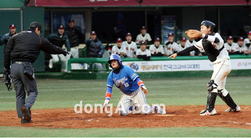 23일 서울 목동야구장에서 열린 제64회 황금사자기(동아일보사 스포츠동아 대한야구협회 공동 주최) 전국고교야구대회 16강전 경기고-덕수고의 경기. 4회초 경기고의 박동현이 타자의 안타에 홈인하였다.