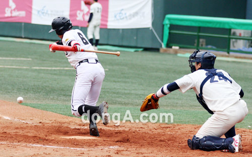 26일 서울 목동야구장에서 열린 제64회 황금사자기(동아일보사 스포츠동아 대한야구협회 공동 주최) 전국고교야구대회 8강전 신일고-광주제일고의 경기. 2회말 광주제일고의 백왕중이 번트와 동시에 1루로 달리고 있다.