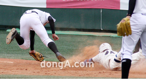 26일 서울 목동야구장에서 열린 제64회 황금사자기(동아일보사 스포츠동아 대한야구협회 공동 주최) 전국고교야구대회 8강전 신일고-광주제일고의 경기. 2회초 신일고의 김민욱이 내야땅볼을 치고 1루로 슬라이딩 하지만 아웃당한다.