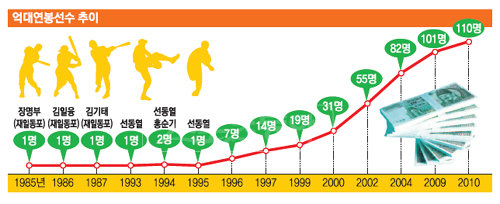 프로야구 선수가 외제차를 타고 다니던 것만으로도 화제가 되던 시절이 있었다. 1980년대 후반, 당시 OB의 주축투수이던 장호연(49)은 여론의 뭇매를 맞고 결국 벤츠 승용차를 처분해야 했다. 그리고 20년의 세월이 흘렀다. 물론 전반적인 국민소득수준의 이유도 있지만, 이제 프로야구선수가 외제차를 타고 다닌다고 손가락질할 팬들은 없다. 몸이 재산인 프로야구 선수라면 그만한 소비는 할 수 있다는 인식 덕분이다. 스타선수들은 부의 상징이기도 하다. 프로야구 원년인 1982년. 선수들의 평균연봉(이하 전체선수단 대상)은 1215만원이었다. 2010시즌에는 8687만원(외국인·신인선수 제외). 무려 615%%가 증가했다. 한국은행 경제통계시스템에 따르면 1982년부터 2009년까지 소비자평균물가는 307%%가 뛰었다. 물가상승률보다 2배 이상 프로야구 선수들의 구매력이 증가한 셈이다. 프로야구 최초의 억대 연봉선수는 1985년 장명부(삼미·1억484만원). 재일동포 선수를 제외하면 선동열(93년·1억)이다. 하지만 2010년에는 억대 연봉자가 110명이나 된다. 프로야구 8개 구단의 총 소속선수(396명·신인·외국인선수제외)를 고려하면, 28%%에 이르는 수치.