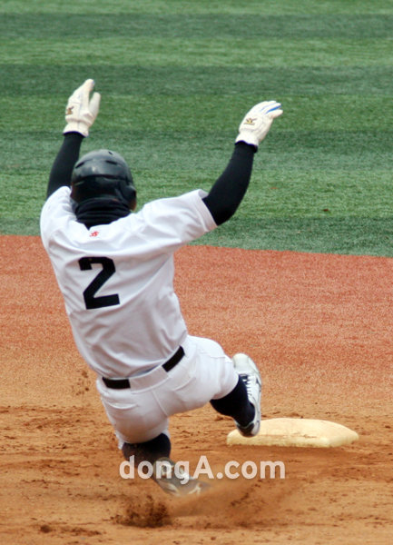 27일 서울 목동야구장에서 열린 제64회 황금사자기(동아일보사 스포츠동아 대한야구협회 공동 주최) 전국고교야구대회 4강전 경남고-장충고의 경기. 2회초 경남고의 김귀용이 2루로 슬라이딩 하고 있다.