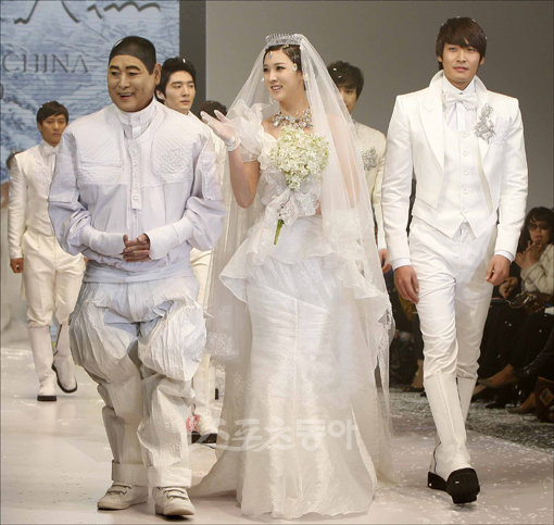 29일 오전 중국 베이징 뉴차이나 국제전시센터에서 '중국국제의류액세서리박람회'(CHIC)의 한국관 전시의 일환으로 디자이너 앙드레 김 패션쇼 '프리뷰 인 차이나(Preview in China)'가 열렸다. 패션쇼를 마친 앙드레 김(왼쪽)이 모델 이수경·정겨운과 함께 인사하고 있다.