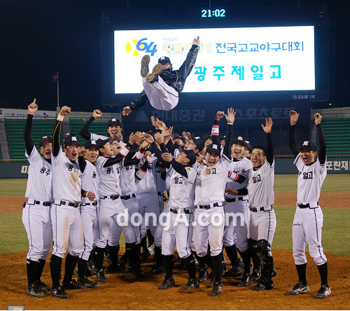 29일 서울 잠실야구장에서 열린 제64회 황금사자기(동아일보사 스포츠동아 대한야구협회 공동 주최) 전국고교야구대회 결승전 광주제일고-장충고의 경기. 우승을 차지한 광주제일고의 선수들이 감독과 환호하고 있다.