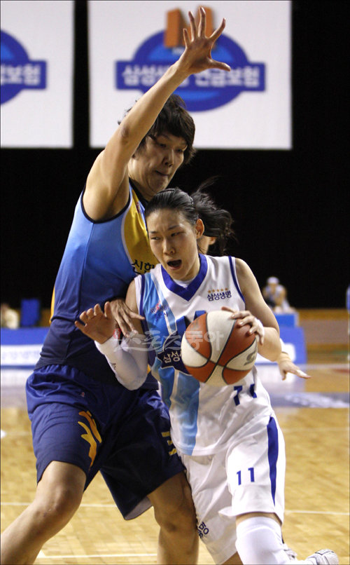 2일 용인실내체육관에서 열린 2009-2010 여자프로농구 챔피언결정전 2차전 신한은행 대 삼성생명의 경기에서 삼성생명 박정은이 신한은행 하은주를 상대로 골밑 돌파를 시도하고 있다.
