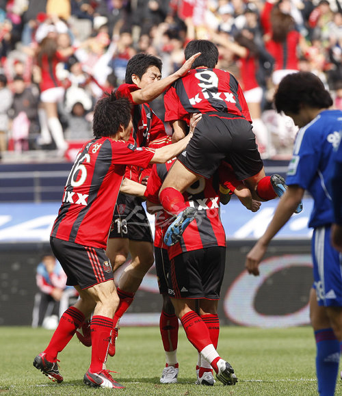 4일 오후 서울월드컵경기장에서 열린 프로축구 쏘나타 K-리그 2010 FC 서울와 수원 삼성의 경기. 에스테베즈가 첫 골을 뽑아낸 뒤 동료들의 축하를 받고 있다.