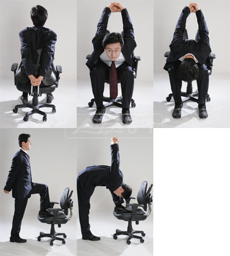 1.의자에 앉아 등 뒤에서 깍지를 끼고 상체를 세우며 가슴을 활짝 펴준다. 10초 정지 2∼3회 반복한다.