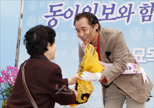 배우 독고영재(오른쪽)가 5일 오후 서울 세종로 동아미디어센터 앞에서 무궁화 선양운동의 하나로 마련 된 ‘무궁화 묘목 나눠주기’행사에 참석해 시민들에게 무궁화 묘목을 나눠주고 있다.