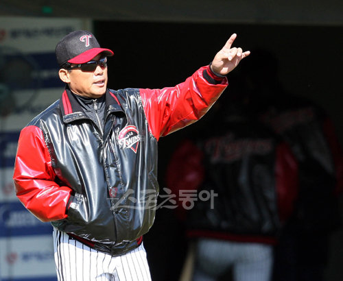 LG의 새 사령탑 박종훈 감독이 경기 중 선수들에게 사인을 내고 있다. 에이스 봉중근마저 2군에 내리는 강공 드라이브를 선택하면서 시즌 초반부터 선수단 체질개선을 위해 팔을 걷어붙인 박 감독이다. 스포츠동아 DB