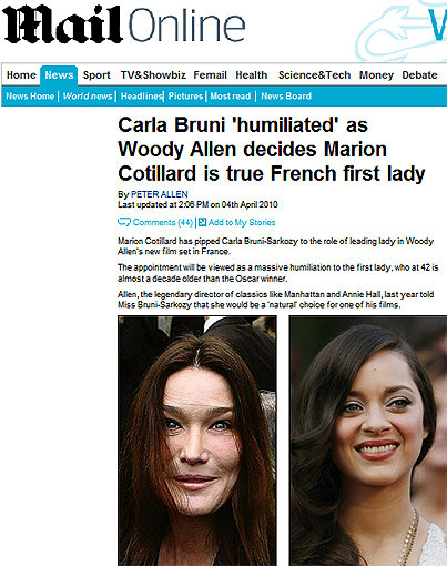영국 대중지 데일리메일은 4일(현지시간) “거장 우디 앨런 감독의 새 영화에서 프랑스의 퍼스트레이디 역할을 맡을 것으로 예상됐던 브루니 여사가 캐스팅에서 실패의 아픔을 맛봤다”고 보도했다.