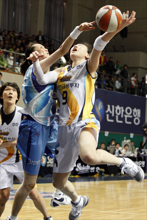 6일 안산 와동체육관에서 열린 2009-2010 여자프로농구 챔피언결정전 4차전 삼성생명 대 신한은행의 경기에서 골밑 돌파를 시도하던 신한 정선민이 삼성 이종애의 파울에 당하고 있다.