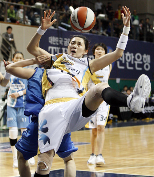 6일 안산 와동체육관에서 열린 2009-2010 여자프로농구 챔피언결정전 4차전 삼성생명 대 신한은행의 경기에서 신한 강영숙이 돌파 도중 상대 수비에 걸려 볼을 놓치고 있다.