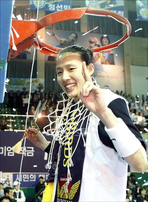 신한은행이 6일 안산 와동체육관에서 열린 2009-2010 여자프로농구 챔피언결정전 삼성생명과의 4차전을 승리로 이끌며 4년연속 통합우승을 달성했다. 전주원이 림의 그물을 자르고 있다.