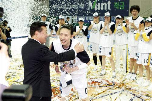 신한은행이 6일 안산 와동체육관에서 열린 2009-2010 여자프로농구 챔피언결정전 삼성생명과의 4차전을 승리로 이끌며 4년연속 통합우승을 달성했다. 전주원이 MVP를 수상하고 있다.