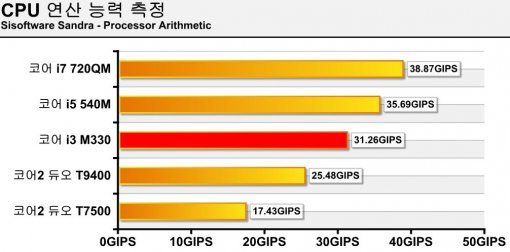 PC의 성능을 체크하는 소프트웨어인 산드라(Sandra)를 기동하여 코어 i3 M330의 성능을 가늠해 보았다. 실행해 본 산드라의 메뉴는 CPU의 전반적인 연산능력을 테스트하는 ‘Processor Arithmetic’ 항목이다. 참고로 다음 그래프에서 사용하는 단위인 GIPS란, 초당 몇 10억 개의 명령어를 처리할 수 있는지를 나타내는 것이다.