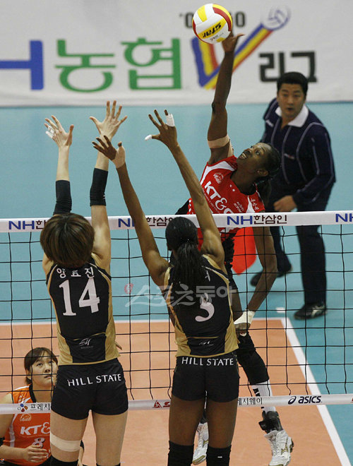 7일 수원실내체육관에서 열린 현대건설과 KT&G의 여자배구 챔프 1차전 경기. KT&G 몬타뇨가 수비벽을 두고 스파이크를 날리고 있다.