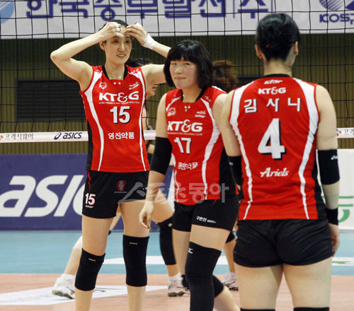 7일 수원실내체육관에서 열린 현대건설과 KT&G의 여자배구 챔프 1차전 경기. 공격에 실패한 KT&G 선수들의 표정이 어둡다. 3대 1로 현대건설 승리.