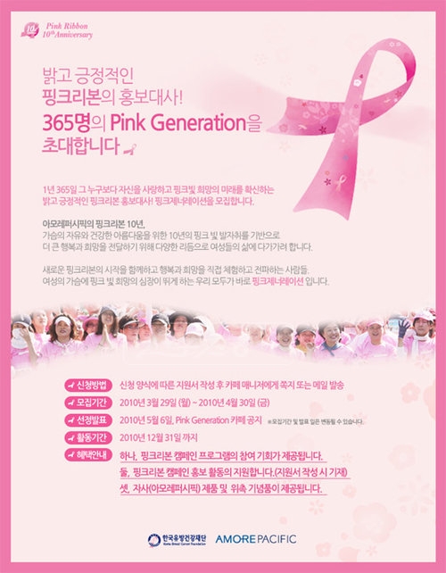 우선 30일까지 자기긍정과 사랑이라는 핑크리본의 의미를 알리는 데 핵심적인 역할을 수행할 일반인 홍보대사 ‘핑크 제너레이션’을 모집한다. 또한 18일 부산을 시작으로 5월 대전, 6월 광주, 9월 대구, 10월 서울 등 전국 5개 도시에서 국내 핑크리본캠페인의 대표행사로 자리잡은 핑크리본사랑마라톤 대회를 개최한다.