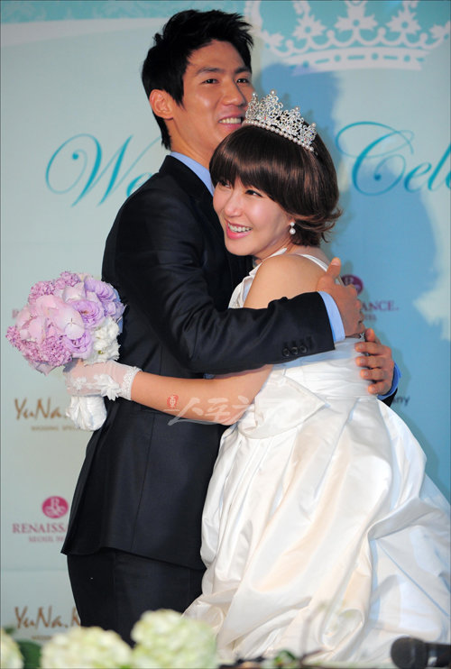 가수 슈(오른쪽)와 프로농구선수 임효성이 11일 오후 서울 강남구 역삼동 르네상스 호텔에서 웨딩마치를 울렸다.