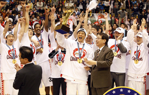 울산 모비스가 11일 서울 잠실실내체육관에서 열린 2009-2010 프로농구 챔피언결정전 전주 KCC와의 6차전을 97-59 승리로 이끌며 통합우승을 차지했다. 모비스 주장 우지원이 우승컵을 들고 함성을 지르며 기뻐하고 있다.