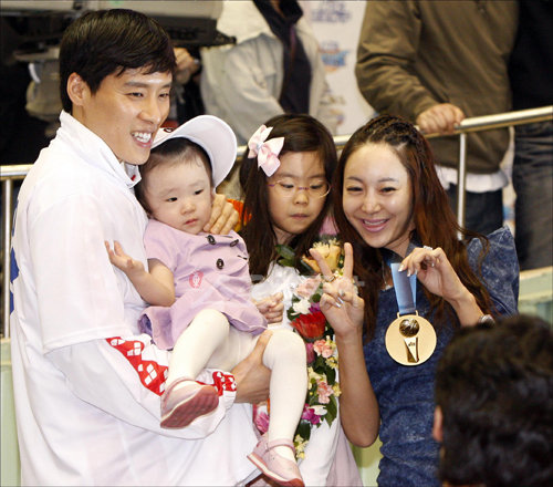 울산 모비스가 11일 서울 잠실실내체육관에서 열린 2009-2010 프로농구 챔피언결정전 전주 KCC와의 6차전을 97-59 승리로 이끌며 통합우승을 차지했다. 모비스 주장 우지원이 부인 이교영 씨와 자녀들에게 다가가 우승목걸이를 안겨주며 기념촬영을 하고 잇다.