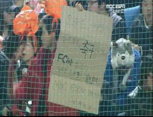 그런데 롯데팬들의 응원모습을 비춰주던 중계방송사 MBC ESPN의 방송화면에 재미있는 장면이 포착됐다. 붉은색 점퍼를 입은 한 팬이 플랜카드를 들고 있는 장면이 잡힌 것. 머리에 롯데 팬임을 상징하는 주황색 비닐봉지를 써 얼핏 야구 팬처럼 보였을지 모르지만 그가 들고 있는 플랜카드에는 정작 축구경기 홍보 문구가 적혀 있었다.