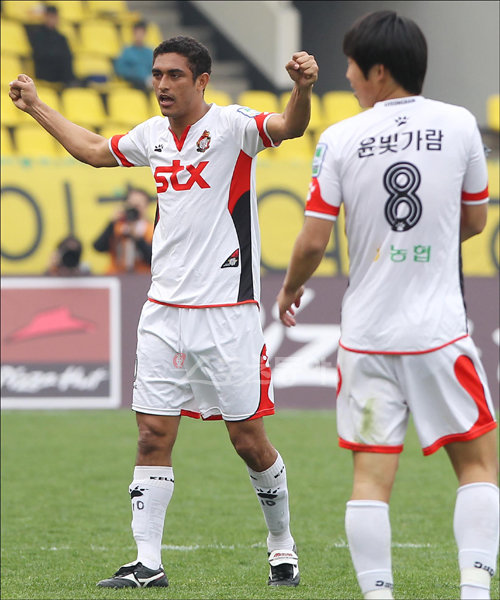 2-1로 경남의 승리로 경기가 끝나자 결승골의 주인공 루시오가 환호하고 있다.