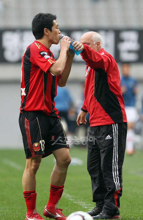 18일 오후 서울월드컵경기장에서 열린 FC 서울과 울산 현대의 2010 K리그 경기. FC 서울 현영민에게 빙가다 감독이 음료를 주고 있다.