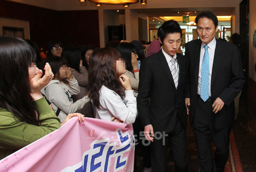 농구스타 이상민이 22일 서울 태평로클럽에서 공식 은퇴 기자회견을 가졌다. 안준호 감독이 회견장에 도착하자 팬들이 연호하고 있다.