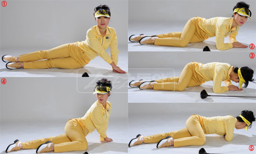 2. 오른쪽 무릎을 바닥에 내리고 상체를 비틀면서 숙이고 양 팔꿈치가 바닥에 닿도록 한다.