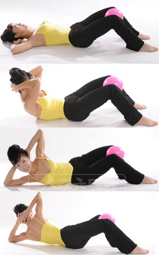 2. 상체만 45도로 들어올린다. 이때 볼을 지그시 눌러준다. 20회 반복 후 10초 정지한다.