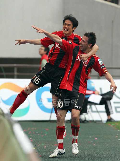 5일 오후 서울월드컵경기장에서 열린 FC 서울과 성남 일화의 2010 K리그 후반 경기. 서울FC의 데얀이 두번째 골을 터트린 후 세리머니하고 있다.