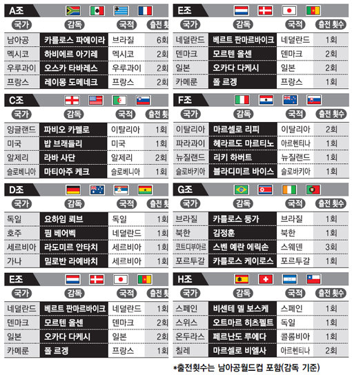 B조에선 스웨덴을 이끌고 2006년 대회에 나섰던 나이지리아 라예르베크 감독을 제외하면 모두 첫 경험이다. C조 알제리의 라바 사단 감독이 86년 멕시코 대회 이후 이번이 두 번째. D조는 수석코치 출신 사령탑의 대결 무대다. 독일 뢰브 감독과 호주 베어벡 감독 모두 4년 전 코치 신분이었다.