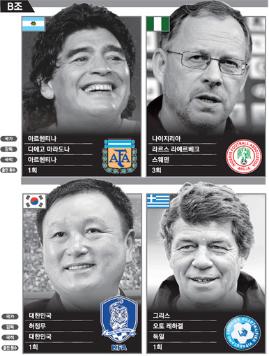아르헨티나는 자국 대표팀을 이끄는 ‘영웅’ 마라도나 감독을 비롯해 칠레(마르셀로 비엘사)와 파라과이(헤라르도 마르티노) 사령탑을 배출했다. 독일은 한국과 같은 B조에 속한 그리스 오토 레하겔 감독과 독일(요아힘 뢰브) 및 스위스(오트마르 히츠펠트)를 이끈다.