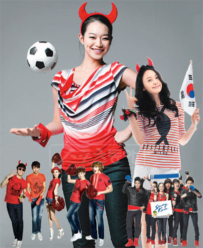 2010 남아공 월드컵을 앞두고 스타들도 응원 열기에 뛰어들었다. 여성 의류 브랜드 씨의 모델 신민아와 베스띠벨리 모델 이나영이 각각 응원 패션을 선보였고, ‘피겨 여왕’ 김연아와 그룹 빅뱅은 현대자동차와 함께 응원가 ‘승리의 함성’을 공개했다. 한효주와 그룹 2AM도 캐주얼 브랜드 잠뱅이의 월드컵 티셔츠를 입었다. 스포츠동아DB