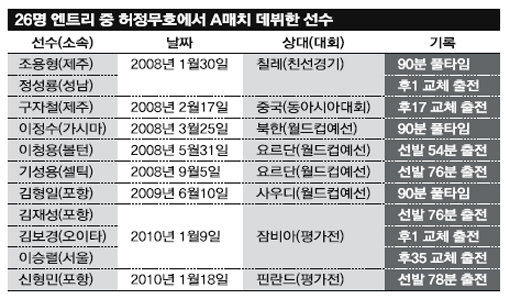 허 감독은 2010남아공월드컵을 앞두고도 많은 선수들을 테스트했다. 2008년 1월 지휘봉을 잡은 이후 총 26명의 선수가 A매치에 데뷔했다. 이들 가운데 총 11명이 17일 발표된 남아공월드컵 예비엔트리 26명에 살아남았다.