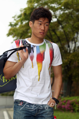 에콰도르 평가전에서 승리를 거둔 태극전사들이 2박 3일 휴가를 마치고 19일 오전 경기도 파주 축구트레이닝센터로 소집됐다. 캡틴 박지성이 가방을 메고 입소하고 있다.