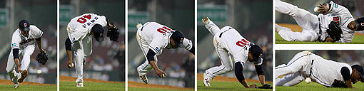 두산 선발진에 또 한번 빨간불이 켜졌다. 다승 공동 1위 히메네스가 19일 잠실 한화전 4회 2사 2·3루에서 한화 신경현의 내야 땅볼 타구를 잡으려다 넘어졌다. 히메네스는 곧바로 교체됐다. 잠실|김종원 기자 won@donga.com