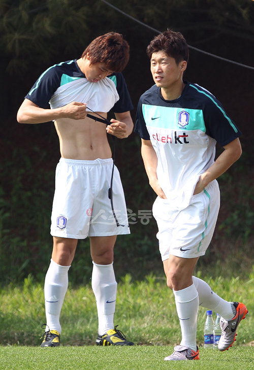 20일 오후 경기도 파주 축구트레이닝센터에서 열린 남아공 월드컵 축구대표팀 훈련에서박지성(오른쪽)이 무선시스템을 착용하고 훈련장으로 나서고 있다.
