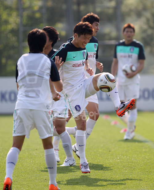 20일 오후 경기도 파주 축구트레이닝센터에서 열린 남아공 월드컵 축구대표팀 훈련에서 박지성이 볼패스를 받고 있다.