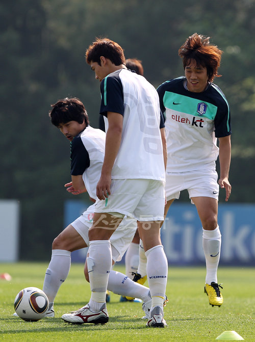 20일 오후 경기도 파주 축구트레이닝센터에서 열린 남아공 월드컵 축구대표팀 훈련에서 안정환과 박주영이 볼을 쫒고 있다.