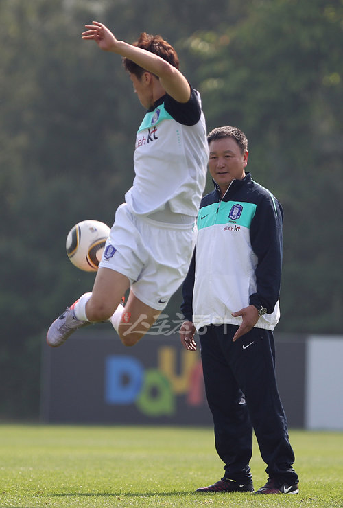 20일 오후 경기도 파주 축구트레이닝센터에서 열린 남아공 월드컵 축구대표팀 훈련에서 박지성이 허정무 감독 앞에서 볼을 빼앗고 있다.