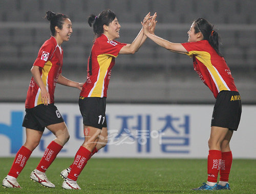24일 오후 고양종합운동장에서 열린 2010 여자프로축구 서울시청과 부산상무의 경기. 서울시청 박윤주가 세번째 골을 뽑아낸 후 기뻐하고 있다. 3대 1로 서울시청 승리.