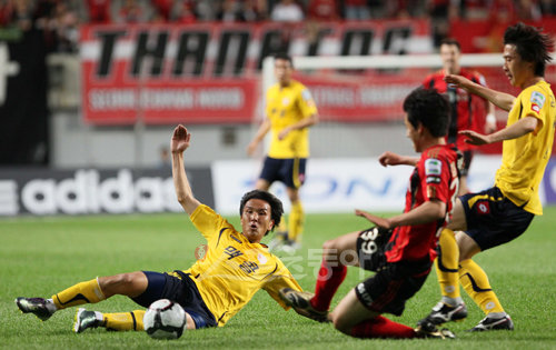 26일 서울 상암월드컵경기장에서 열린 ‘포스코컵 2010’ FC서울과 성남 일화의 경기. 성남 전광진과 서울 김태환이 볼을 다투고 있다.