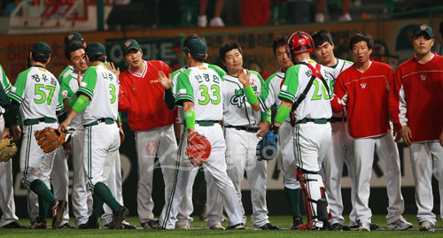 30일 인천 문학구장에서 열린 2010프로야구 SK와 롯데의 경기에서 11대 4로 승리한 SK 선수들이 자축하고 있다.