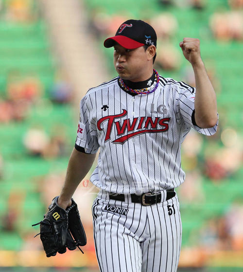 6일 잠실야구장에서 열린 2010 프로야구 LG와 SK의 경기에서 6회초 2사 1,2루 상황에 김강민이 플라이아웃 처리되자 투수 봉중근이 주먹을 쥐어 보이고 있다.