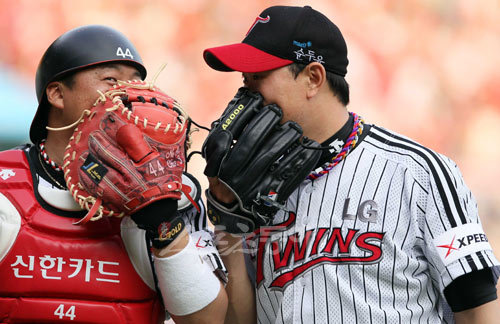6일 잠실야구장에서 열린 2010 프로야구 LG와 SK의 경기에서 5회초 2사 1대 0으로 이기고 있는 LG의 봉중근이 박재상을 잡아내고 조인성과 기뻐하고 있다.