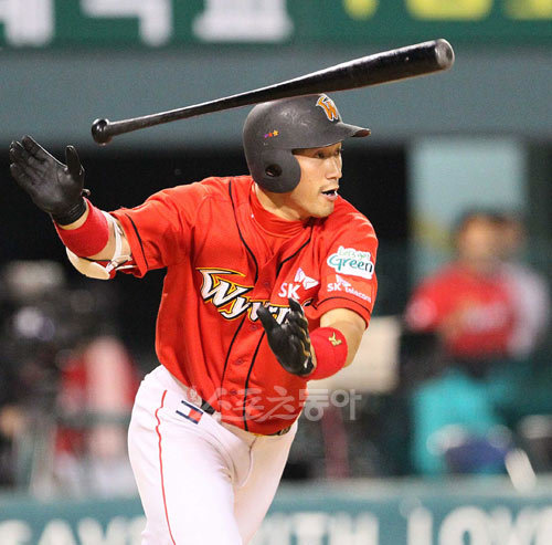 6일 잠실야구장에서 열린 2010 프로야구 LG와 SK의 경기에서 9회말 무사 1,3루 상황에 김재현이 동점 적시타를 때려내고 있다.