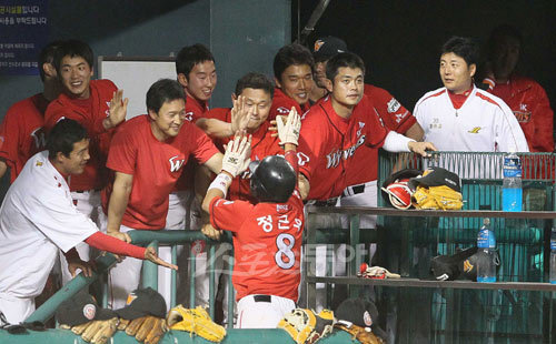 6일 잠실야구장에서 열린 2010 프로야구 LG와 SK의 경기에서 12회초 1사 1,2루 상황에 박정권의 역전 적시타에 정근우가 홈을 밟고 덕아웃에서 동료들의 축하를 받고 있다.